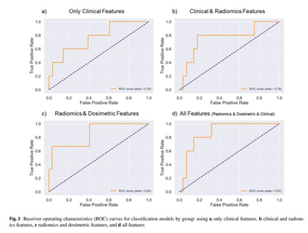 Results: The model that used all features (radiomics, clinical, and dosimetric) showed the highest performance with an AUC of 0.871. The radiomics and dosimetric features model had the superior performance in terms of accuracy, precision, recall, and F1-score.