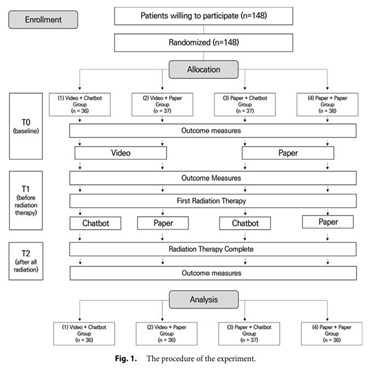 유방암으로 수술후 방사선치료를 받는 환자를 대상으로 챗봇과 영상을 이용한 교육의 효과를 보고한 무작위배정 연구로, 젊은 환자일 경우 방사선치료에 관한 두려움을 줄이는데 효과가 다소 있었다는 점이 흥미롭습니다. 단순히 종이에 적혀있는 글자로 치료 동의서를 얻는데서 그치지 않고 앞으로는 이러한 다양한 방법으로 환자를 교육하는 노력이 있으면 좋겠습니다.
