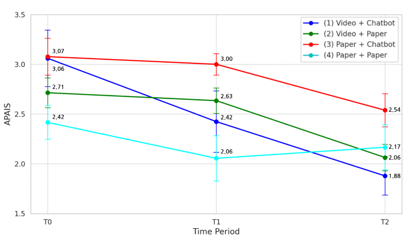 Results: The final analysis included 145 patients. No significant interaction was observed between groups and time for the APAIS, STAI, or LASA. Although unplanned, analyses were conducted using the age of 50 years as the cutoff, based on a previous systematic review of digital literacy in the medical field. A trend toward reduced APAIS was found among patients aged ≤50 years who used the chatbot (per-protocol subgroup). In the video + chatbot group, the APAIS score decreased from 3.06 (T0) to 1.88 (T2); in contrast, in the paper + paper group, it decreased from 2.42 (T0) to 2.06 (T2). In contrast, no significant interaction was observed in the APAIS of per-protocol patients aged ≥50 years.