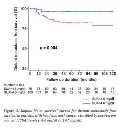 Results: A total of 185 patients were analyzed, with a median follow-up of 63.3 months. The mean pre-treatment SUA level was 5.4 mg/dl, which decreased to 5.2 mg/dl post-treatment, though the difference was not statistically significant (p=0.326). A post-treatment SUA cut-off of 4.6 mg/dl demonstrated discriminatory ability for distant metastasis-free survival (DMFS) but was not predictive of overall survival or locoregional relapse-free survival (LRFS). Kaplan-Meier analysis showed that patients with post-treatment SUA ≥4.6 mg/dl had significantly poorer DMFS than those with lower levels [hazard ratio (HR)=1.25, 95% confidence interval (CI)=1.02-1.53; p=0.004]. Multivariable analysis confirmed post-treatment SUA ≥4.6 mg/dl (HR=5.01, p=0.010), HPV-negative oropharyngeal tumors (HR=5.68, p=0.025), and Stage IV disease (HR=4.10, p=0.020) as independent prognostic factors for DMFS.