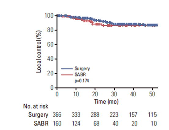 Conclusion: SABR was used in patients with a higher risk of progression compared to those undergoing surgery, yet it has similar local control rates to wedge resection.