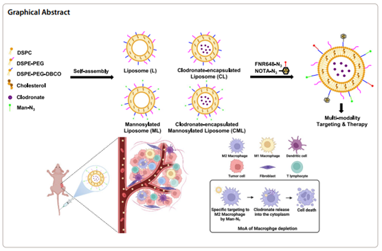 Background: Immunotherapy with clodronate-encapsulated liposomes, which induce macrophage depletion, has been studied extensively. However, previously reported liposomal formulation-based drugs (Clodrosome® and m-Clodrosome®) are limited by their inconsistent size and therapeutic efficacy. Thus, we aimed to achieve consistent therapeutic effects by effectively depleting macrophages with uniform-sized liposomes.Results: We developed four types of click chemistry-based liposome nanoplatforms that were uniformly sized and encapsulated with clodronate, for effective macrophage depletion, followed by conjugation with Man-N3 and radiolabeling. Functionalization with Man-N3 improves the specific targeting of M2 macrophages, and radioisotope labeling enables in vivo imaging of the liposome nanoplatforms. The functionalized liposome nanoplatforms are stable under physiological conditions. The difference in the biodistribution of the four liposome nanoplatforms in vivo were recorded using positron emission tomography imaging. Among the four platforms, the clodronate-encapsulated mannosylated liposome effectively depleted M2 macrophages in the normal liver and tumor microenvironment ex vivo compared to that by Clodrosome® and m-Clodrosome®.