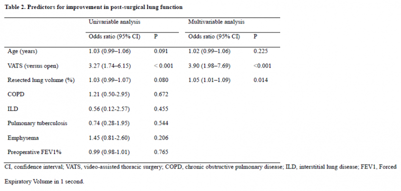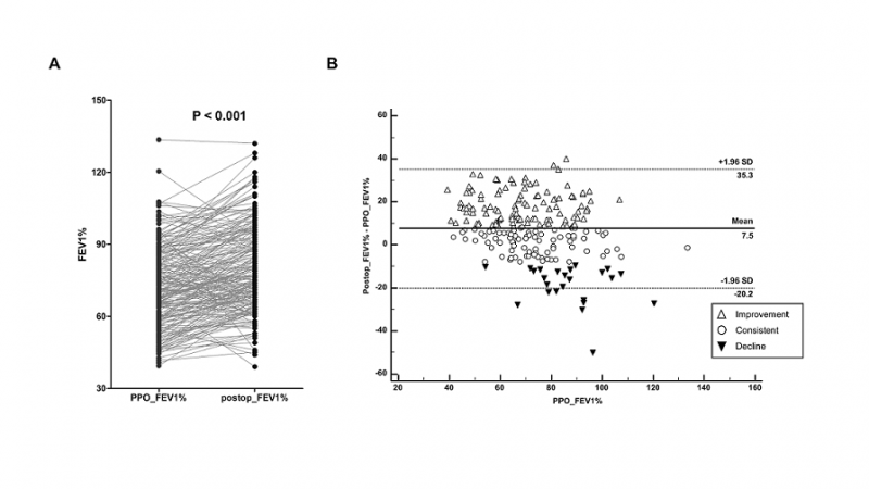 Results: From 216 patients (men:women, 150:66; age, 67.9 ± 8.7 years), predicted postoperative FEV1% (ppoFEV1%) showed significant correlation with actual postoperative FEV1% ( r = 0.667; P < 0.001). Paired t test revealed that ppoFEV1% was significantly lower compared with actual postoperative FEV1% ( P < 0.001). The study identified video-assisted thoracic surgery (VATS) (odds ratio [OR], 3.90; 95% confidence interval [CI], 1.98-7.69; P < 0.001) and higher percentage of resected volume (OR per 1% increase, 1.05; 95% CI, 1.01-1.09; P = 0.014) as significant predictors of postsurgical lung function improvement. Conversely, for the decline in lung function postsurgery, significant predictors included lower percentage of resected lung volume (OR per 1% increase, 0.92; 95% CI, 0.86-0.98; P = 0.011), higher preoperative FEV1% (OR, 1.03; 95% CI, 1.01-1.07; P = 0.009), and the presence of tuberculosis (OR, 5.19; 95% CI, 1.48-18.15; P = 0.010). Additionally, in a subgroup of patients with borderline lung function, VATS was related with improvement.