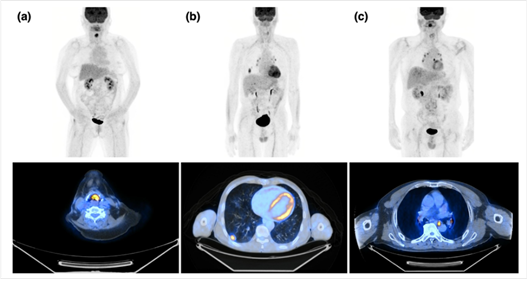 HNSCC로 근치적 치료를 받은 서로 다른 환자에서 촬영한 surveillance FDG PET/CT의 MIP (위), transaxial fusion (아래) 영상으로, (a) 후두의 국소 재발, (b) 폐의 원격 전이, (c) 식도에 발생한 이차암 소견을 surveillance FDG PET/CT를 이용해 성공적으로 진단했습니다.