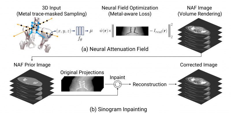 - 최근 인공지능(AI) 기반 3차원 의료영상처리에서 주목받는 Neural Attenuation Field(NAF)를 활용하여 새로운 금속 인공음영 저감 기법(MAR)을 제안한 연구입니다. 본 논문은 데이터 집약적 학습 대신 단일 데이터를 이용한 최적화 기반 학습으로 고품질 prior 영상을 생성하고, 이를 바탕으로 금속 인공음영을 효과적으로 저감할 수 있음을 보여줍니다. 본 연구는 딥러닝과 기존 물리 모델을 융합한 시도로, 향후 관련 연구에 좋은 참고가 되었으면 좋겠습니다.