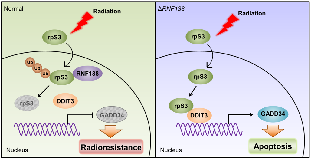 - 교아종(GBM)의 방사선저항성에 영향을 미치는 분자적 기전을 규명한 논문입니다. 방사선이 조사된 교아종 세포에서 rpS3가 세포질에서 핵으로 이동한 후 RNF138에 의해 유비퀴틴화되어 분해되며, 이로 인해 교아종 세포의 방사선저항성이 증가하게 됩니다. rpS3의 세포사멸 기능을 확인하기 위하여, CRISPR/CAS9 시스템을 통하여 RNF138의 유전자 적중을 유도한 교아종 세포를 이용하여 rpS3의 인터렉톰을 분석하여 DDIT3를 선별하였습니다. 핵에서 분해되지 않을 경우 rpS3는 DDIT3와 상호작용하여 세포사멸을 촉진시키는 데 기여함을 in vitro 및 in vivo에서 확인하였습니다. 본 연구를 통하여 rpS3의 세포사멸 기능을 방해하는 RNF138을 표적하는 것이 교아종의 방사선 치료 효율을 향상시킬 수 있는 대안이 될 수 있음을 밝힐 수 있었습니다.
