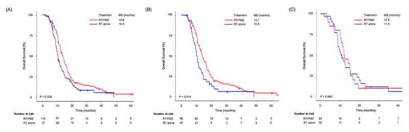 Results: During a median follow-up of 11.3 months for survivors, the median survival was 12.2 months. The median survival duration significantly improved with the addition of TMZ to RT compared with that with RT alone (13.6 months vs. 10.5 months, p=0.028). In the multivariable analysis adjusted for clinical, radiological, and genetic biomarkers, the addition of TMZ significantly improved overall survival (hazard ratio, 0.459; p=0.006). In subgroup analysis, median survival was especially improved by 4-5 months in patients with residual disease (p < 0.001), Karnofsky performance status ≥ 60 (p=0.033), and age ≤ 75 years (p=0.090). A significant benefit of TMZ was noted only in patients with two or three of the above factors (median survival, 14.1 months vs. 10.5 months; p=0.014).