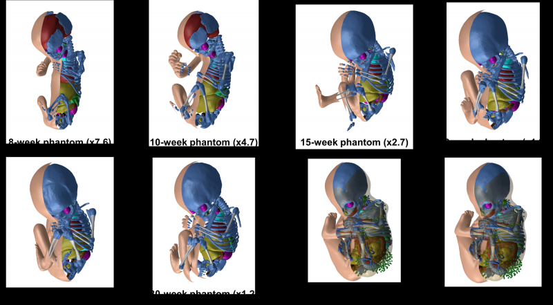 본 그림은 본 연구를 통해 개발한 태아나이 8주, 10주, 15주, 20주, 25주, 30주, 35주, 38주에 대한 메시형 태아 팬텀을 보여줍니다. 개발된 태아팬텀은 태아나이 별 인체치수, 장기질량 등 해부학적 요소를 정밀하게 반영하고 있습니다.