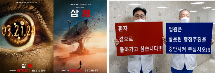 < (좌)넷플릭스 ‘삼체’ 광고, (우)연세대 의대 교수들이 25일 서울 서대문구 신촌 세브란스병원에서 열린 전국의과대학교수협의회 기자회견을 마친 후 요구안이 든 손팻말(연합뉴스 제공) >