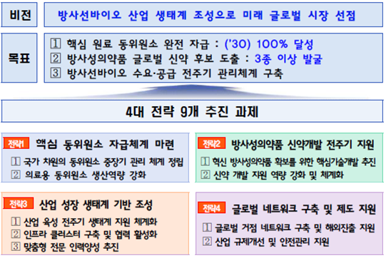 결국 미국 정부 R&D 예산은 줄어들어도 AI, 첨단바이오, 반도체 등과 같은 패권기술 투자는 강화할 것으로 전망되는 가운데 11월 7일(목) ‘방사선바이오 성과창출 전략(안)’이 국가과학기술자문회의 의결을 통해 발표되었다.7) 미래 유망시장으로 급부상한 방사성의약품 시장 선점을 위해 혁신기술개발, 인프라 고도화, 산업생태계 기반 조성 등을 추진하여 2030년까지 핵심 원료 동위원소 자급, 방사성의약품 신약후보 3종 이상 발굴 등을 목표로 하고 있다.
