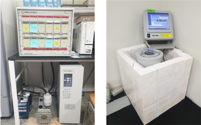< (왼) Canberra PIPS SPD-100-12 알파분광분석장비, (오) Capintec CRC-55tR Dose calibrator >