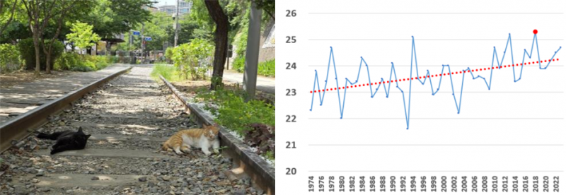 < 더위에 지쳐 늘어져 계시는 공트럴파크 주인님들, 1974년부터 우상향 중인 여름 평균 기온2)>