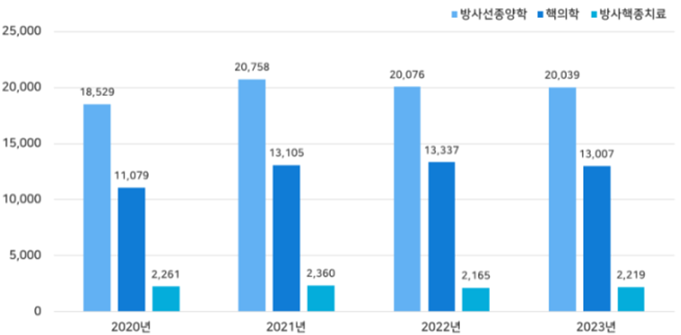 2020년부터 2023년까지 방사선의학 주요 분야에서 발표된 논문들을 검색한 결과, 방사선종양학 분야는 79,402편, 핵의학진단(PET, SPECT) 분야는 50,828편, 방사핵종치료 분야는 9,005편으로 나타났다. 연도별·분야별 논문 편수는 방사선종양학과 핵의학 분야는 2020년 대비 2023년에 발표된 논문편수가 각각 1,510편, 1,928편 증가했으나 방사핵종치료 분야는 2020년 대비 2023년 발표 논문 편수가 소폭 하락한 것으로 나타났다.