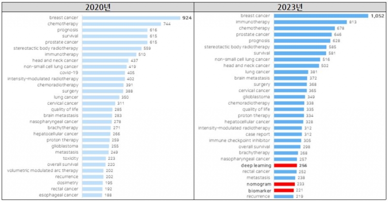 2020년과 2023년에 발간된 방사선의학 분야별 논문들을 중심으로 텍스트마이닝 분석을 진행했다. 방사선종양학 분야에서 2020년에 가장 많이 등장한 논문 키워드는 breast cancer’(924건), ‘chemotherapy’(744건), ‘prognosis’(616건), ‘prostate cancer’/‘survival’(615건)으로 나타났다. 2023년에는 ‘breast cancer’(1,052건), ‘immunotherapy’(813건), ‘chemotherapy’(678건), ‘prostate cancer’(646건), ‘prognosis’(628건)인 것으로 집계되었다.