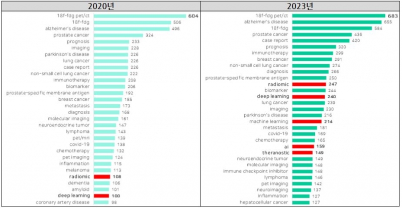 핵의학진단 분야는 2020년에는 ‘18f-fdg pet/ct’(604건), ‘18f-fdg’(645건), ‘alzheimer’s disease’(496건), ‘prostate cancer’(324건), ‘prognosis’(233건) 순이었으며 2023년에는 ‘18f-fdg pet/ct’(683건), ‘alzheimer’s disease’(655건), ‘18f-fdg’(584건), ‘prostate cancer’(436건), ‘case report’(420건)으로 나타났다. - 여기서 검색어 ‘18f-fdg’는 의학 용어로 핵의학에서 PET/CT 검사에 가장 널리 쓰이는 방사성의약품 [F-18]FDG을 지칭한다.