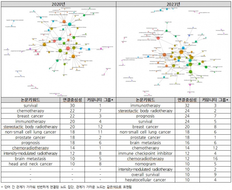 연결 중심성(degree of centrality)을 중심으로 논문 키워드 동시출현빈도(co-occurrence frequency)를 분석한 결과, 2020년 방사선종양학 분야에서는 ‘survival’ 키워드가 다른 논문 키워드들과 가장 밀접하게 연결된 것으로 나타났으며 ‘chemotherapy, ‘breast cancer’, ‘immunotherapy’, ‘stereotactic body radiotherapy’ 키워드가 그 뒤를 이었다. 2023년에는 ‘immunotherapy’ 키워드가 가장 연결중심성이 높았으며 ‘stereotactic body radiotherapy’, ‘prognosis’, ‘survival’, ‘breast cancer’ 키워드가 다른 키워드들과 밀접하게 연결되는 것으로 나타났다.