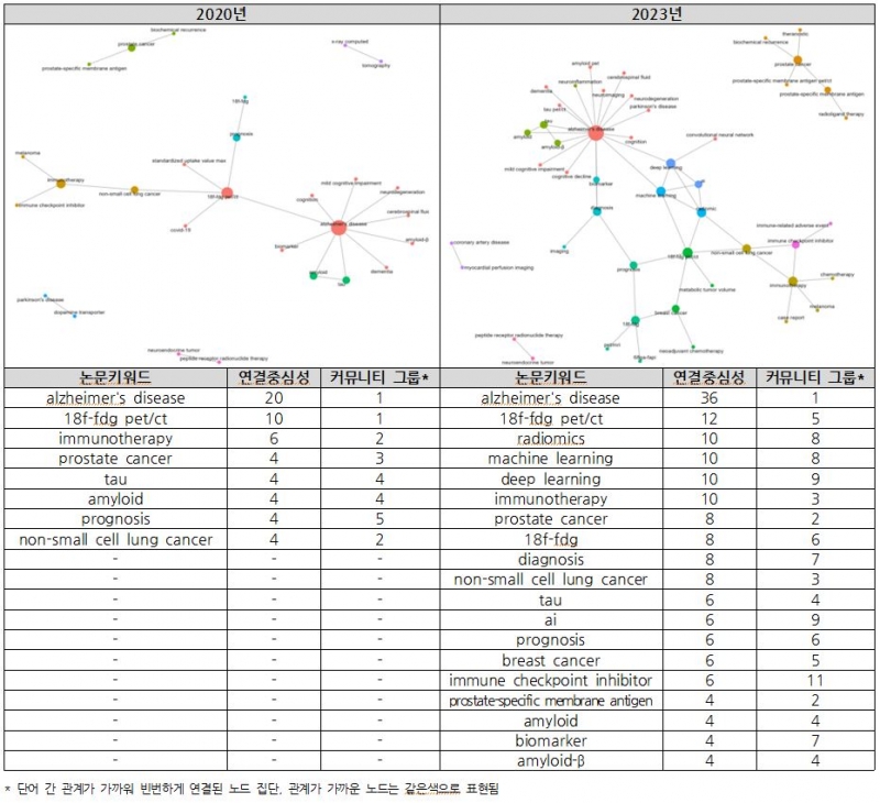 2020년 핵의학 분야에서는 ‘alzheimer’s disease’ 키워드가 다른 논문 키워드들과 가장 밀접하게 연결된 것으로 나타났으며 ‘18f-fdg pet/ct’, ‘immunotherapy’, ‘prostate cancer’, ‘tau’ 키워드가 그 뒤를 이음. 2023년은 2020년과 마찬가지로 ‘alzheimer’s disease’ 키워드가 가장 연결중심성이 높았으며 ‘18f-fdg pet/ct’, ‘radiomics’, ‘machine learning’, ‘deep learning’ 키워드가 다른 키워드들과 밀접하게 연결되는 것으로 나타났다.