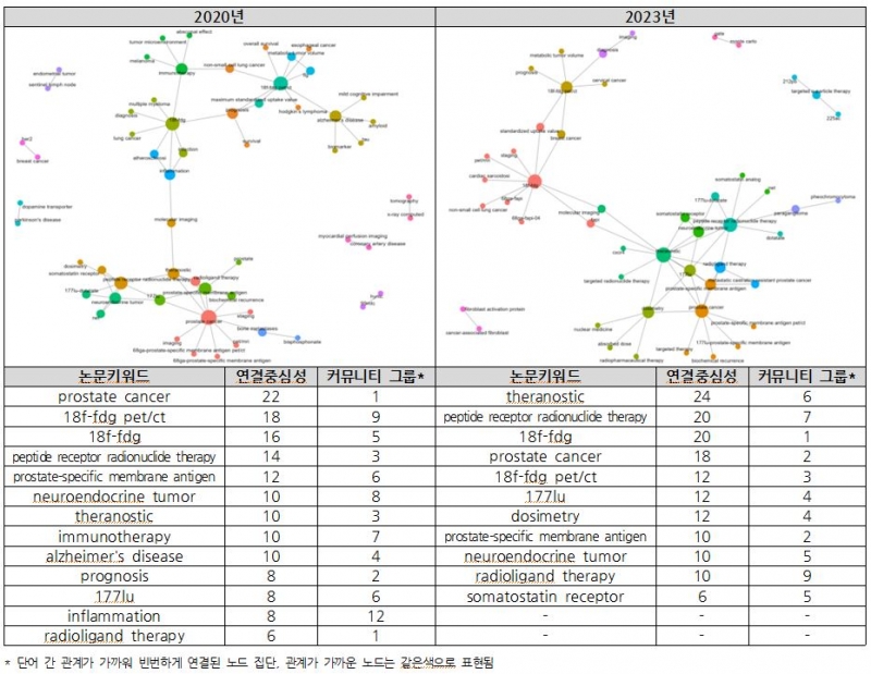 방사핵종치료 분야에서 2020년에 가장 많이 등장한 논문 키워드는 ‘18f-fdg pet/ct’(173건), ‘18f-fdg’(172건), ‘prostate cancer’(137건), ‘prostate-specific membrane antigen’(103건), ‘peptide receptor radionuclide therapy’(91건)이었고 2023년에는 ‘18f-fdg’(178건), ‘18f-fdg pet/ct’(152건), ‘prostate cancer’(132건), ‘prostate-specific membrane antigen’(102건), ‘peptide receptor radionuclide therapy’(100건) 이었다.