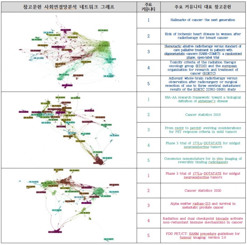 Leiden algorithm을 적용하여 인용 횟수가 20건 이상인 참고문헌들을 대상으로 사회연결망 분석을 진행했다. 2020년에 발표된 방사선종양학 분야 참고문헌 커뮤니티 중 가장 큰 클러스터를 구성하는 대표논문은 ‘Hallmarks of cancer: the next generation’, 핵의학진단 분야는 ‘NIA-AA research framework: toward a biological definition of alzheimer’s disease’, 방사핵종치료 분야는 ‘Phase 3 trial of 177Lu-DOTATATE for midgut neuroendocrine tumors’ 논문이었다.