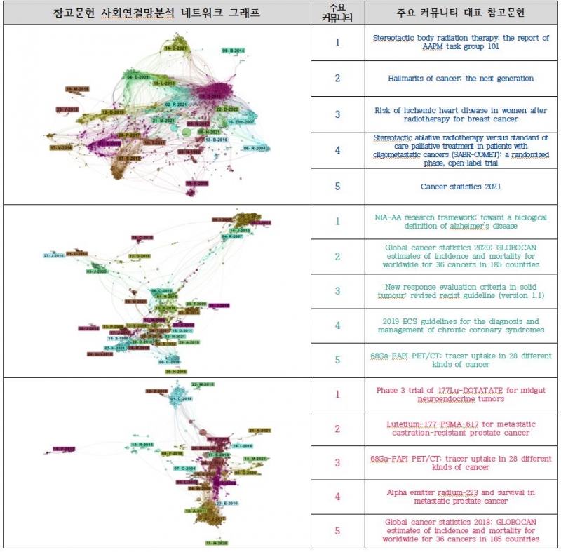 2023년 방사선종양학 분야는 ‘Stereotactic body radioation therapy: the report of AAPM task group 101’, 핵의학진단 분야는 ‘NIA-AA research framework: toward a biological definition of alzheimer’s disease’ 논문이 참고문헌 사회연결망 커뮤니티 중 가장 큰 클러스터를 구성하는 대표논문이었고, 방사핵종치료 분야는 ‘Phase 3 Trial of 177Lu-Dotatate for Midgut Neuroendocrine Tumors’ 논문으로 나타났다.