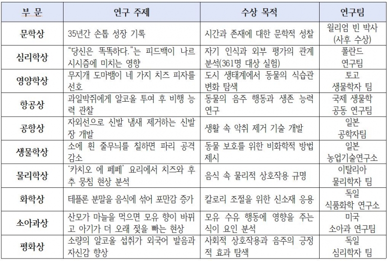 이 밖에도 올해 이그노벨상은 수상자들의 유쾌한 수상 방식에서 기인하는 단순한 흥미보다 그 내용 안에서 나오는 무릎을 탁하고 치는 과학적 연구가 돋보인다. 국가의 경제를 살리고, 지구와 인류의 건강을 살리고, 뭔가 우주를 향해 가는 과학기술도 중요하지만, 어쩌면 우리는 과학의 본질을 잊어버리고 사는 것은 아닌지. 과학은 인간의 호기심에서 시작하고, 그 호기심의 과학기술 문화 속에서 더 단단하게 성장한다. 그러나 우리 과학계는 과학자에게 너무 과도한 진지함을 요구한다.▣