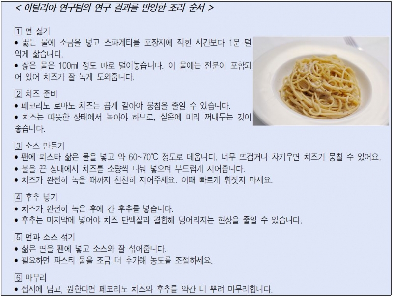 이탈리아의 연구팀은 전통적인 파스타 요리인 ‘카치오 에 페페(Cacio e Pepe)’에서 치즈와 후추가 뭉치는 현상을 물리학적으로 분석한 연구로 과학계의 웃음과 찬사를 동시에 받았다. ‘카치오 에 페페’는 단순한 재료로 만들어지는 이탈리아의 대표적인 파스타 요리다. 삶은 면에 페코리노 로마노 치즈와 후추를 넣고 섞는 방식인데, 이 과정에서 치즈가 후추와 함께 덩어리져 뭉치는 현상이 자주 발생한다. 많은 요리사들은 이를 방지하기 위해 다양한 조리법을 시도해 왔지만, 이탈리아 연구팀은 이 문제를 물리학적으로 접근했다. 연구팀은 치즈의 단백질 입자와 물의 온도, 점성, 그리고 후추의 입자 크기와 표면 전하가 어떻게 상호작용하는지를 실험적으로 분석했다. 그 결과, 특정 온도와 교반 속도에서 치즈 단백질이 응집되며 후추 입자와 결합해 덩어리를 형성한다는 사실을 밝혀냈다. 특히 물의 온도가 너무 낮거나 너무 높을 경우, 치즈가 균일하게 녹지 않아 후추와 함께 뭉치는 경향이 강해진다는 점이 확인되었다. 이 연구는 단순한 요리 현상을 넘어, 복잡한 유체역학과 입자 물리학의 원리가 일상 속에 어떻게 숨어 있는지를 보여준다.